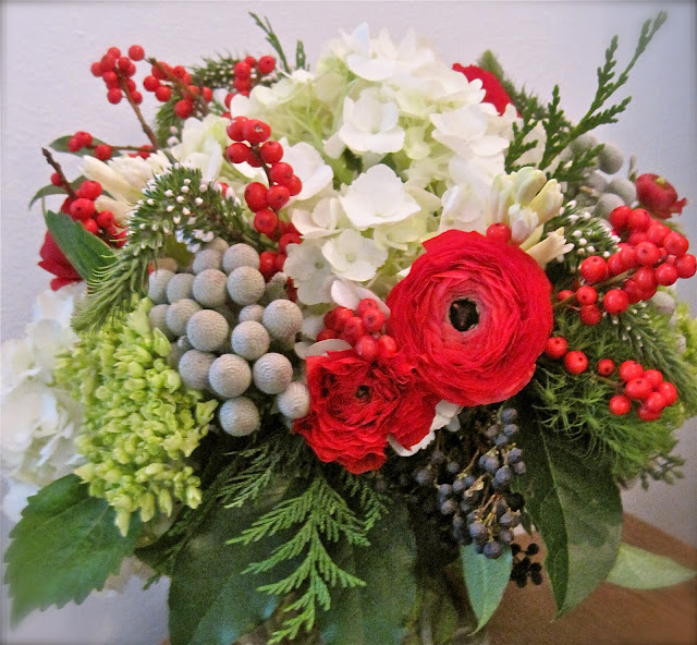 I incorporated pine tree trimmings along with a variety of red and silver berries and of course, white amaryllis!
